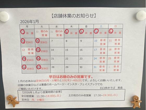 1月8日 石臼挽き 手打ち そば蕎香 1月のお休みです。