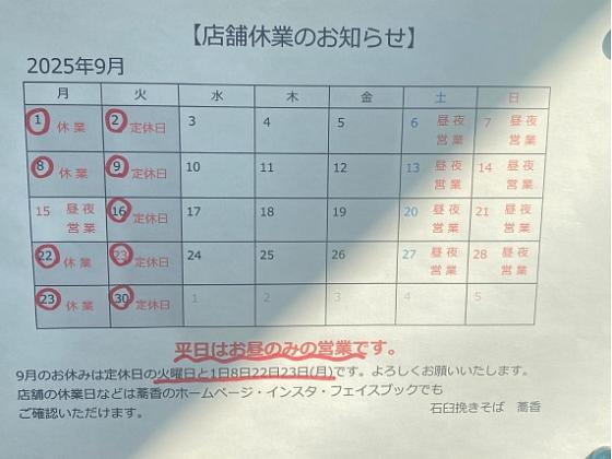 9月4日 石臼挽き 手打ち そば蕎香 9月の休みです。